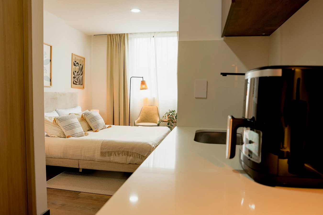 Este moderno estudio de 20 m² para 2 personas en Pasadena ofrece cama queen, escritorio para teletrabajo, cocina equipada, baño completo y Smart TV. Disfruta de vistas a la montaña desde su gran ventanal. El edificio cuenta con coworking, terrazas, zona BBQ, fogatas, lobby y ascensor. Incluye ropa de cama, toallas, kit de baño y limpieza. Con convenio de parking cercano, y a pasos de cafés, restaurantes y estaciones de TransMilenio.