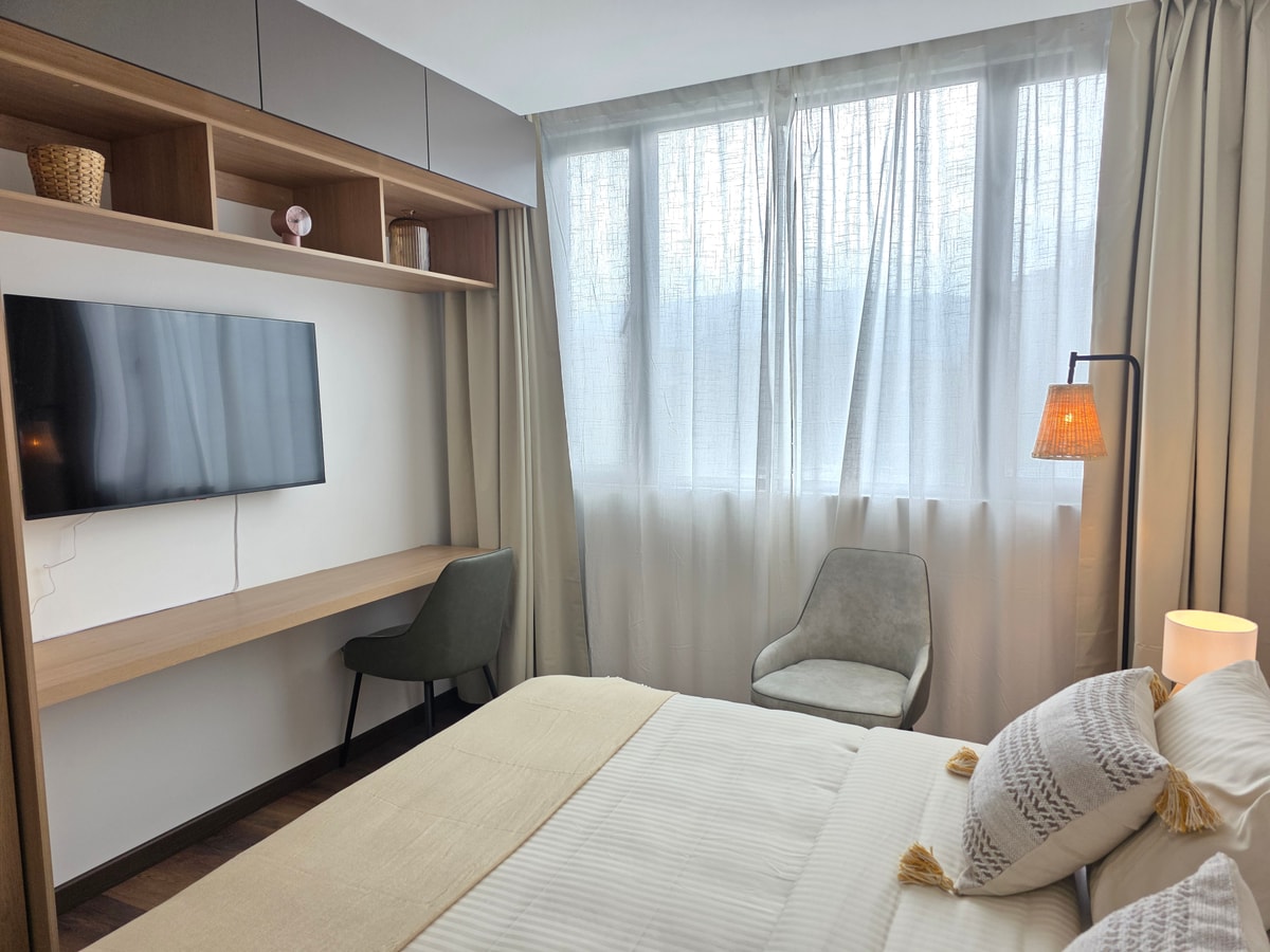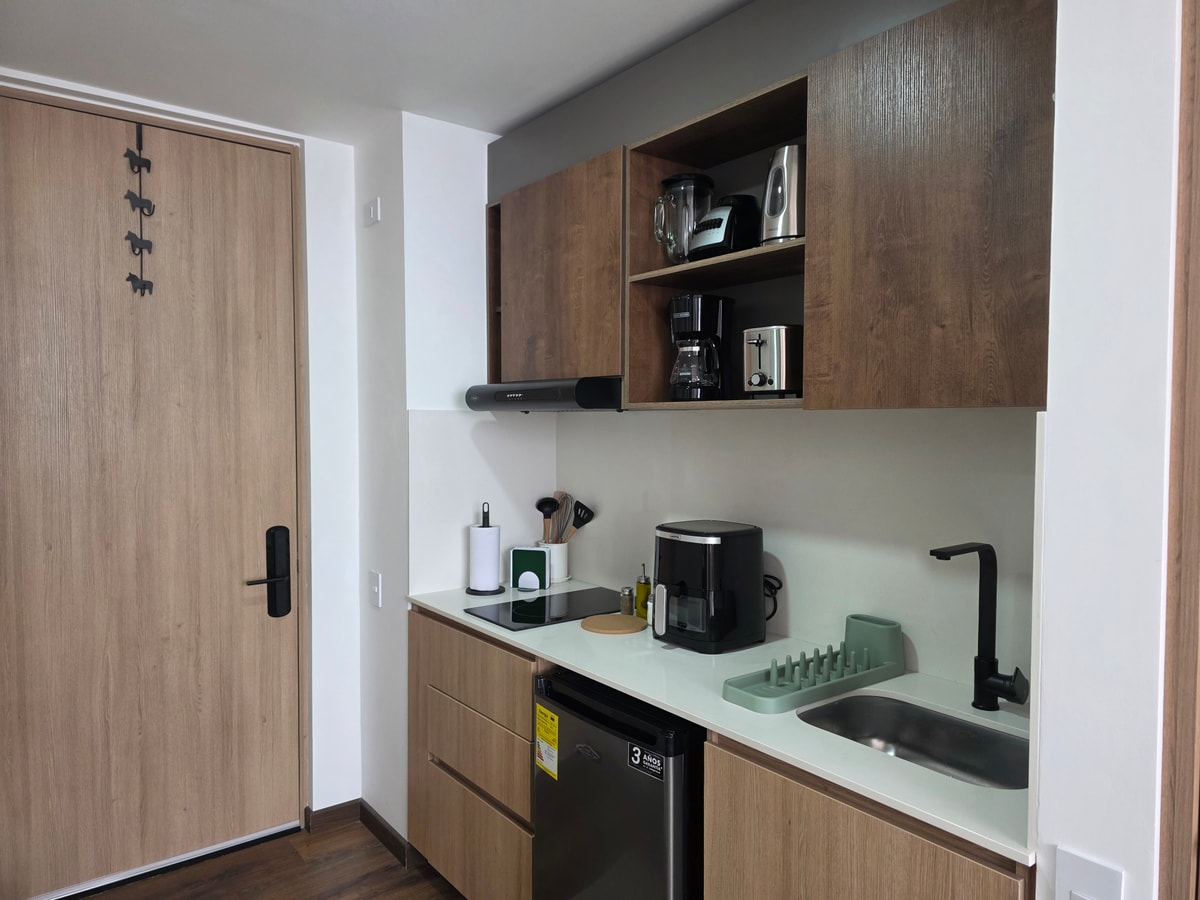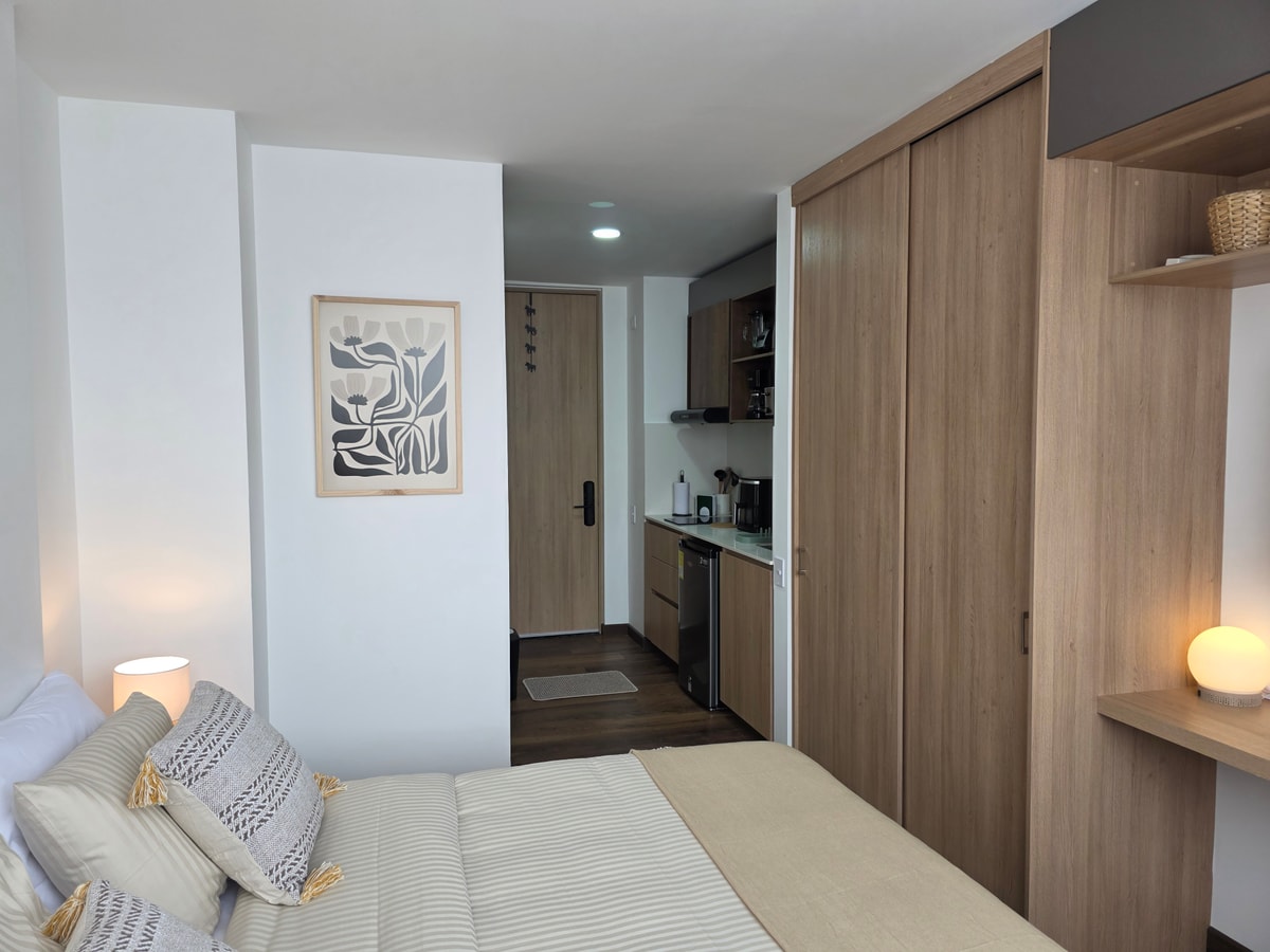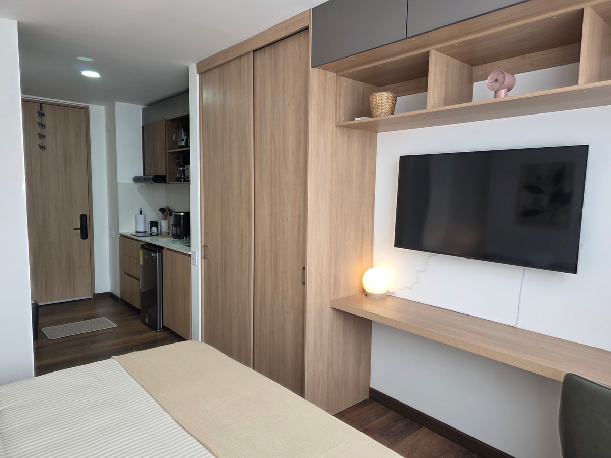 Este moderno estudio de 20 m² para 2 personas en Pasadena ofrece cama queen, escritorio para teletrabajo, cocina equipada, baño completo y Smart TV. Disfruta de vistas a la montaña desde su gran ventanal. El edificio cuenta con coworking, terrazas, zona BBQ, fogatas, lobby y ascensor. Incluye ropa de cama, toallas, kit de baño y limpieza. Con convenio de parking cercano, y a pasos de cafés, restaurantes y estaciones de TransMilenio.